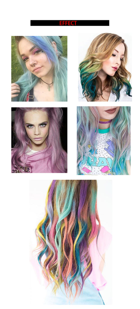 2. Please be careful near water and rain also snow as the chalk may stain your clothes. Also, please be noted that your hair maybe a bit dry after you use the temporary hair chalk, but this does not affect the appearance.